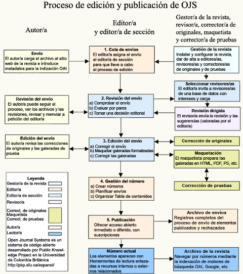 OJS realiza los envíos a la revista a través de cinco pasos durante un proceso editorial gestionado por uno o más de los editores/as.